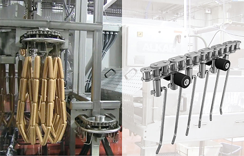 食品行业主要产品有滚子链、长节距输送链条、不锈钢链条、各种表面特殊处理的专用链条等。广泛应用于各类食品加工机械,如肉类生产线、制面机械、制糖机械、紫菜加工设备、瓜子加工设备、香肠加工设备、乳业灌装设备、冰淇淋生产设备等。东华根据不同的工况,采用优化设计、特殊工艺,选用优质合金钢、不锈钢等材质,提高了链条的耐腐蚀、耐磨损性能,满足各类设备的清洁生产、可靠使用的要求。